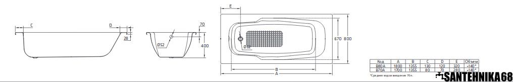 - Ванна стальная "ATLANTICA" 170x80 см B70A22001 BLB с ножками