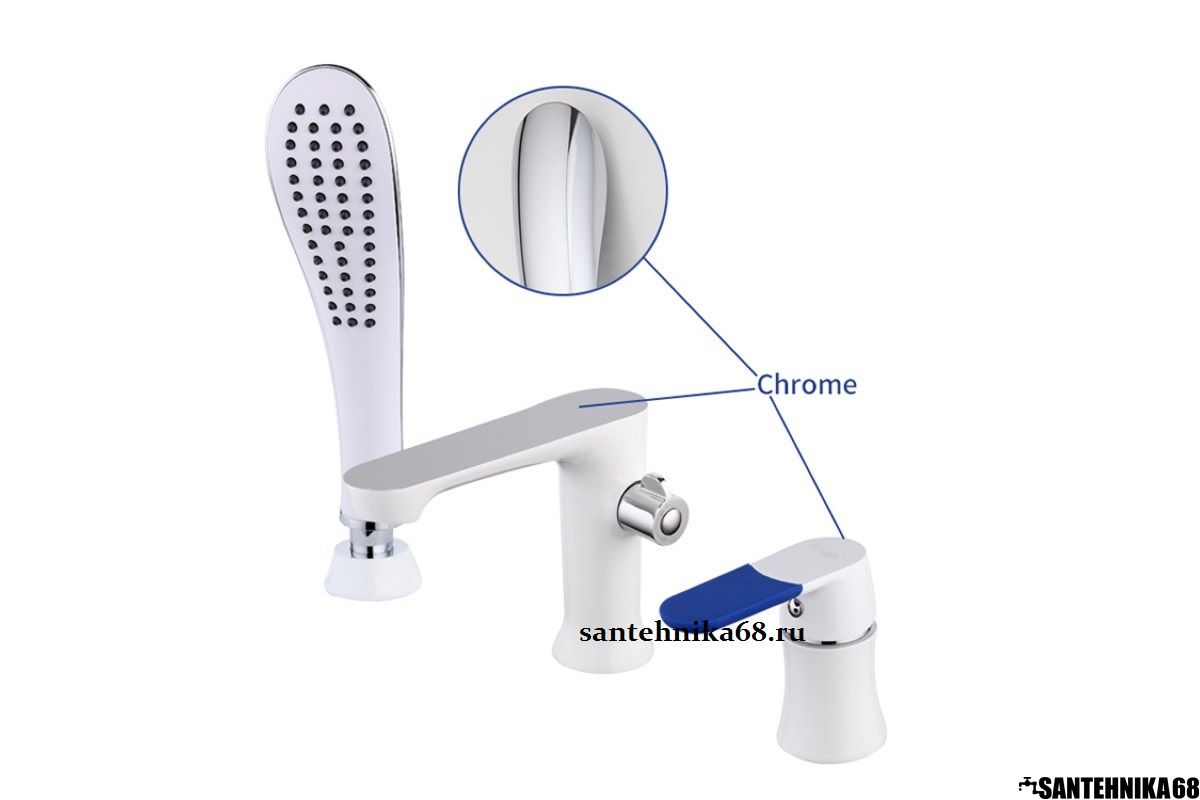 Смеситель на ванну на три отверстия, латунь, картридж 35 мм, белый/хром, 6 сменных накладок на ручку в комплекте