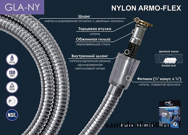 Шланг для душа GS GLA-NY 1,5м металл имп/кон. двойнок замок, нейлоновая вставка хром