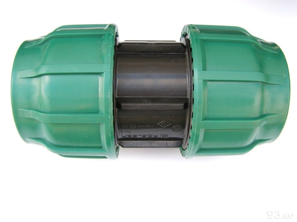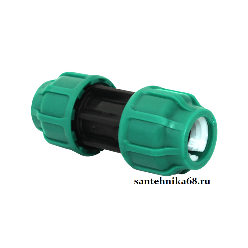 Муфта соединительная компрессионная "зеленой серии" обеспечивает надежное соединение двух полиэтиленовых труб равного диаметра между собой, при строительстве систем питьевого или технического водопровода, систем напорной или безнапорной канализации, для устройства кабельных каналов из ПНД труб с рабочим давлением до 10 атмосфер для труб диаметром от 20мм до 63мм и до 6 атмосфер для труб диаметром от 75 до 110 мм.