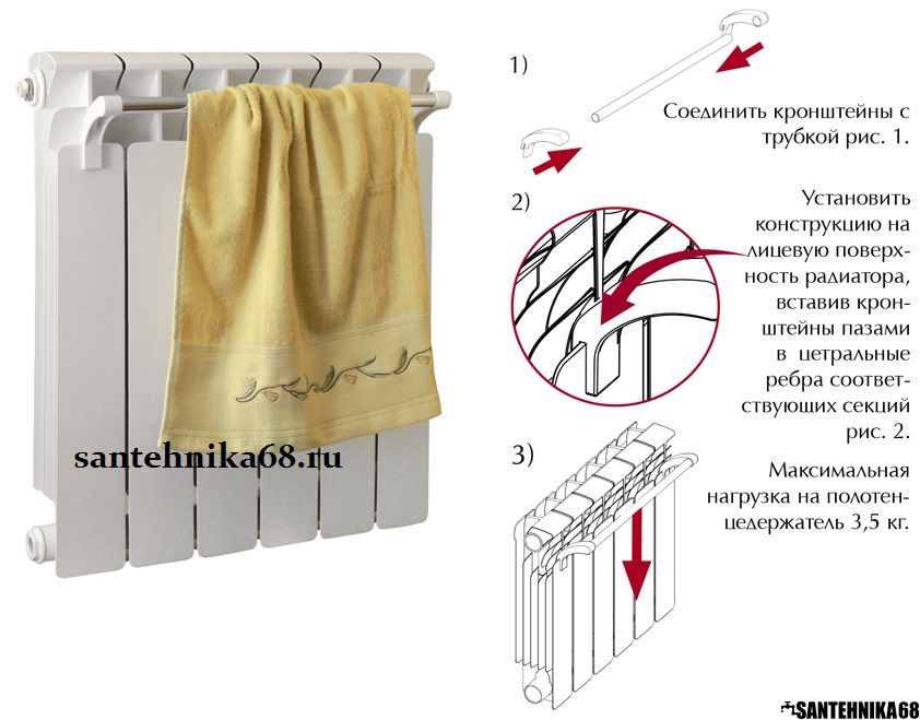 Соединить кронштейны с трубкой, установить конструкцию на лицевую поверхность радиатора, вставив кронштейны пазами в центральные ребра соответствующих секций.