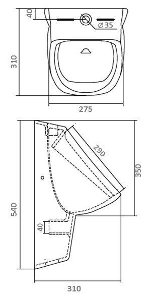 Установка: Подвесная Форма: Прямоугольная Ширина, см: 27,5 Высота, см: 54 Глубина, см: 31 Цвет: белый Материал: фаянс Подвод воды: наружный Механизм слива: сенсорный/механический Стилистика: современный Высота чаши: 54 Назначение: для писсуара -