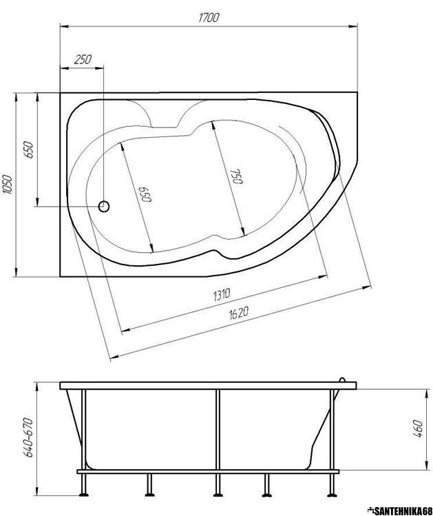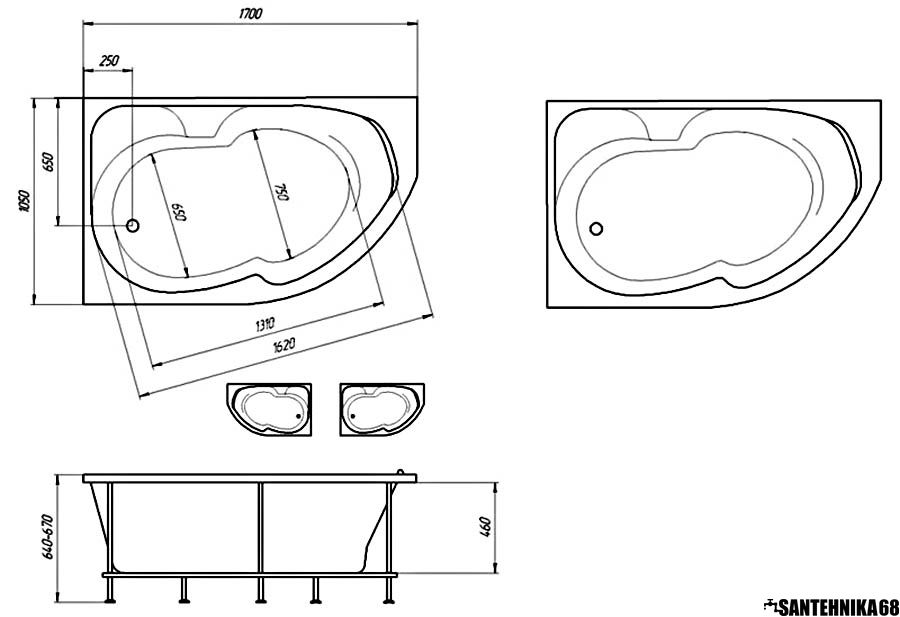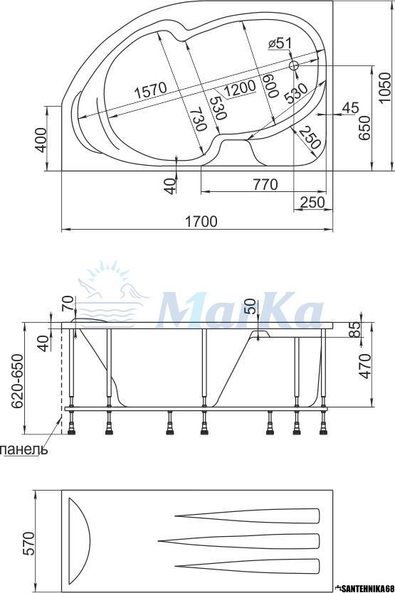 Ванна акриловая 1,7*1,05 Марка1 ДИАНА Левая или правая (каркас+панель)