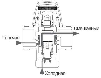Горячая вода подается сбоку, холодная – снизу. В большинстве схем позволяет устанавливать клапан без дополнительных изгибов и Т-образных соединений трубопровода.